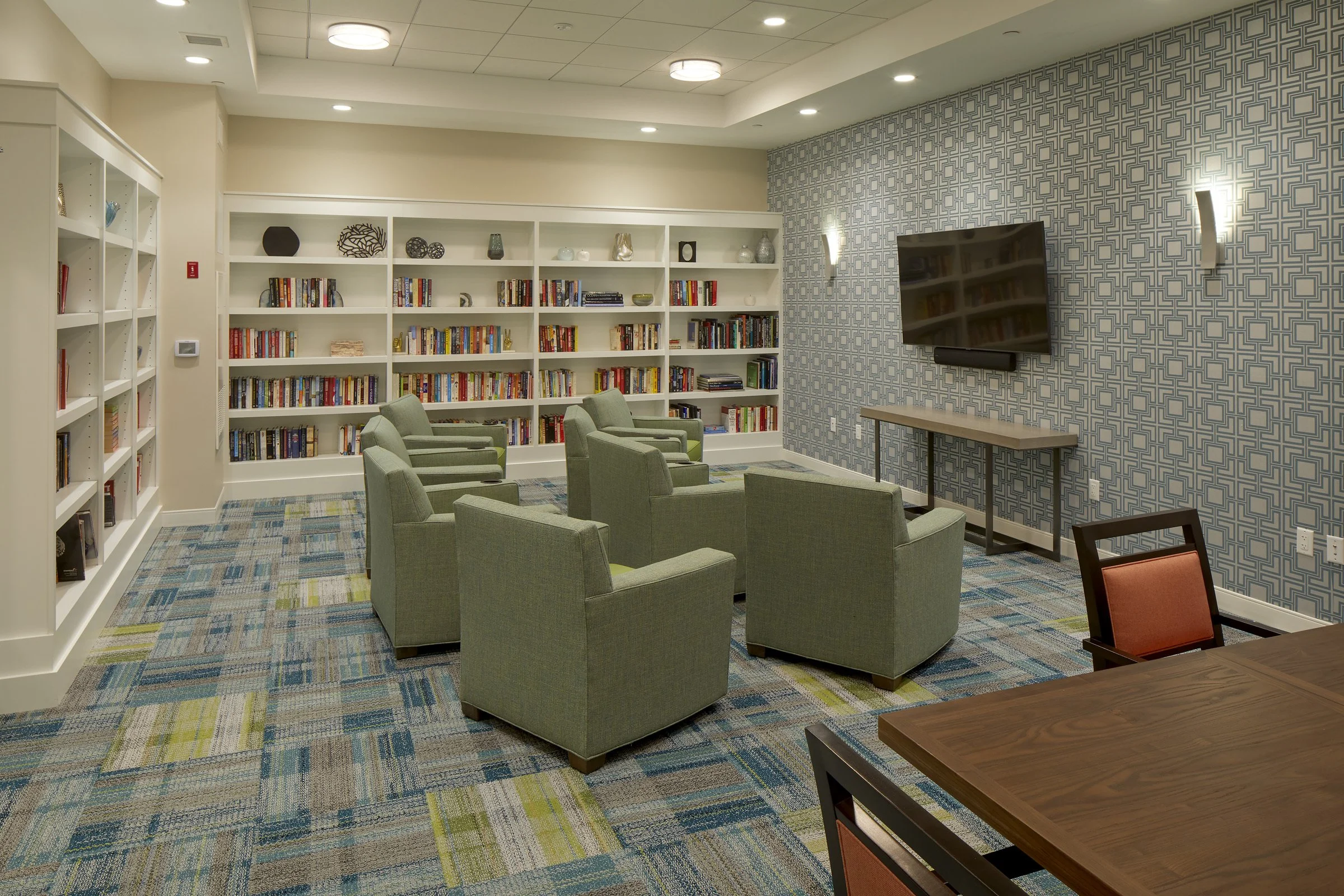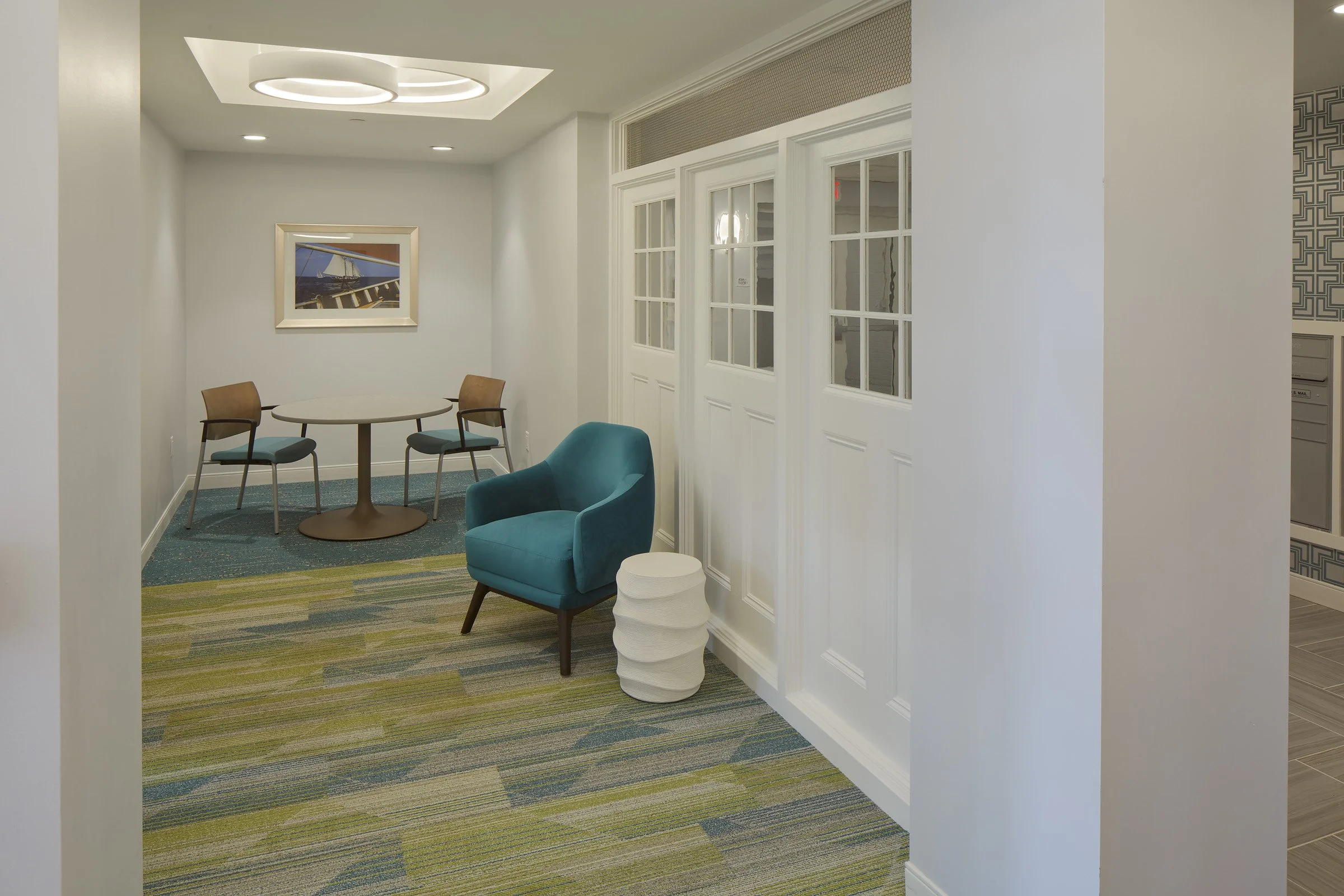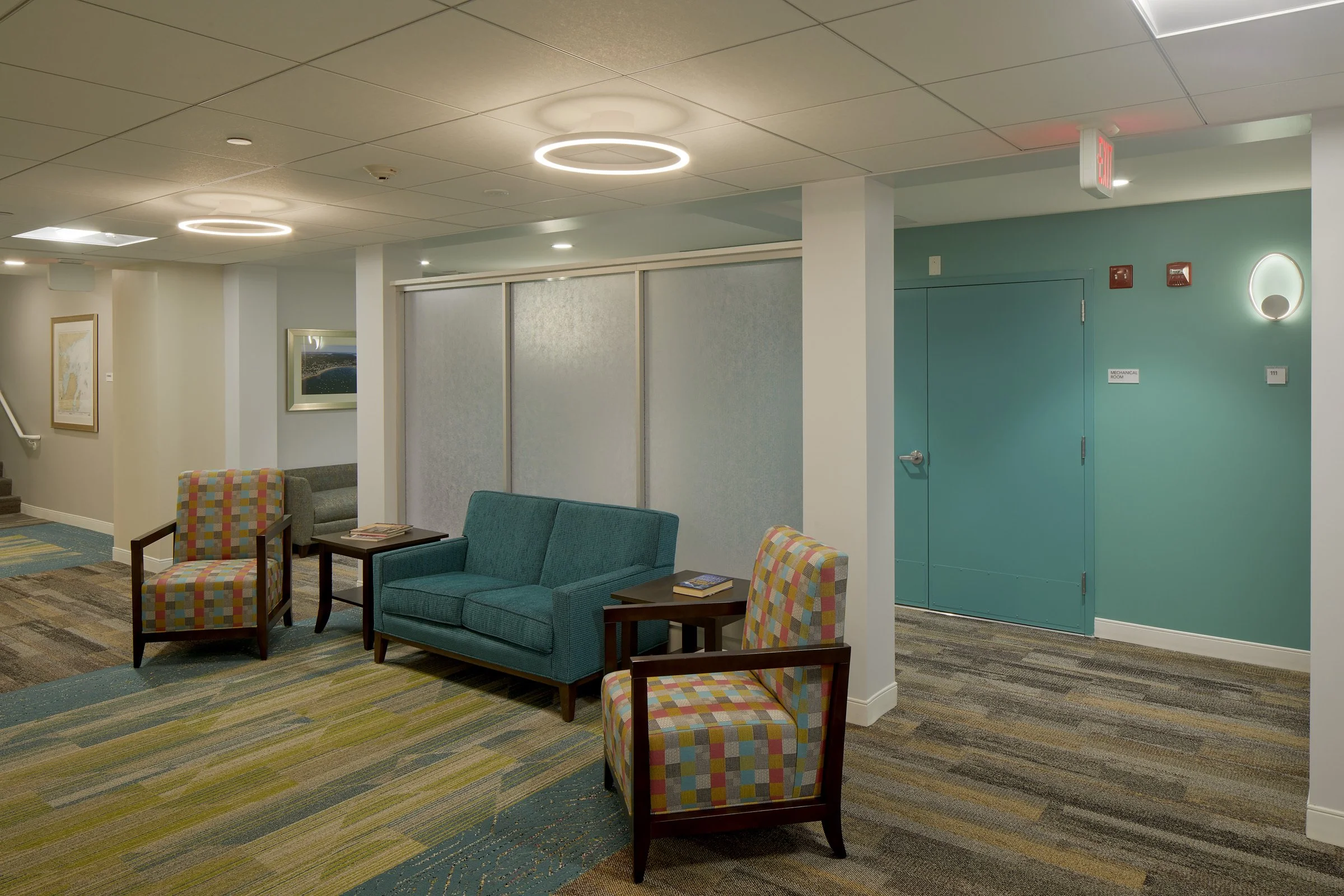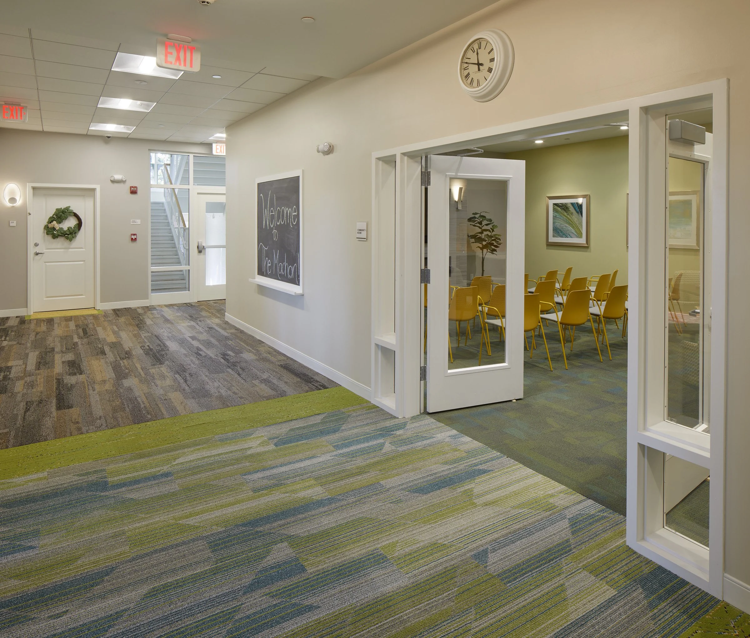 Though Wellesley Design Consultants, Inc. (WDC) had worked with B’nai B’rith before, it was clear this project would be different. Keith Construction joined us again and paid special attention to items that could be reused, repurposed, and recreated. Chalkboards were saved and inspired the ‘chalkboard green’ walls that sat behind white courier type resin panels. These partitions not only give residents a resting and gathering space; they provide separation for the apartments that abut open common areas.